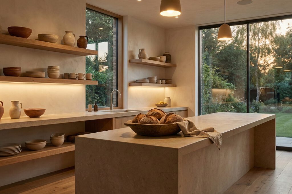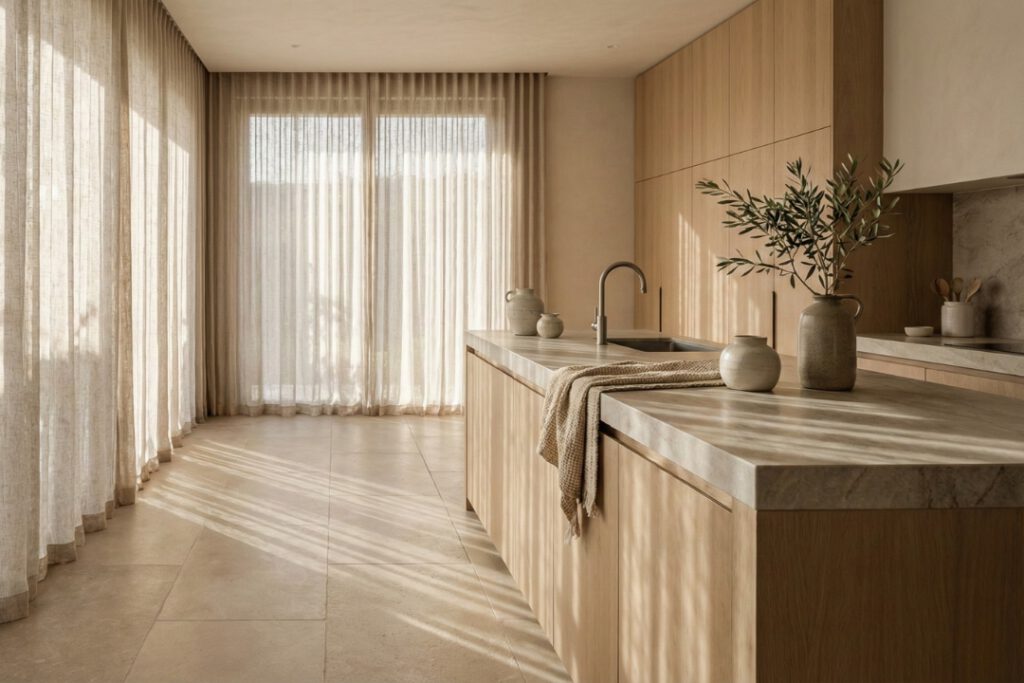 La clave es la luz de ambiente. Cuando cae la tarde, la cocina deja de ser un espacio de trabajo para convertirse en un salón más. Imagina filtrar la luz natural con cortinas de lino (algo impensable en las cocinas de antes) que tamizan el sol y proyectan sombras suaves sobre el suelo de piedra. Es esa “hora dorada” la que hace que una cocina invite a quedarse con una copa de vino en la mano.